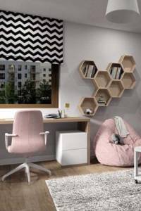 Pokój został tak zaprojektowany, aby dziewczynka miała wygodną przestrzeń do nauki. Biurko ustawione przy oknie zapewnia naturalne światło, a ergonomiczne krzesło sprzyja zdrowej postawie podczas pracy przy komputerze czy odrabiania lekcji.